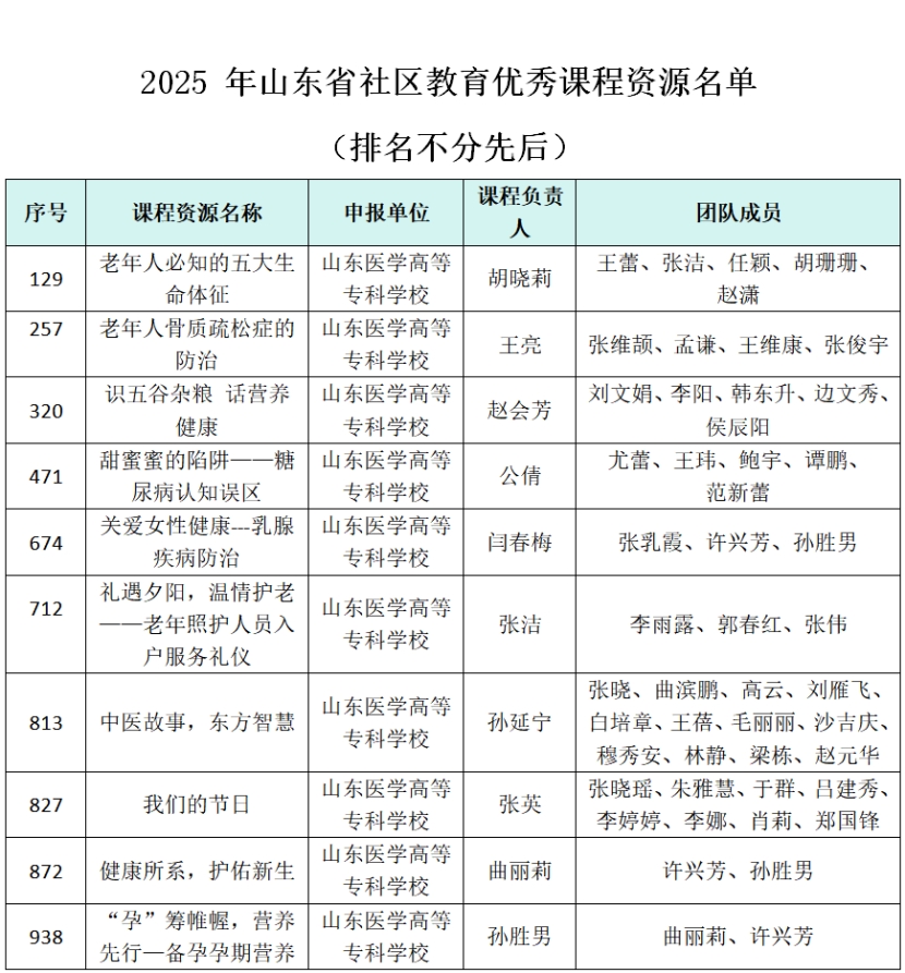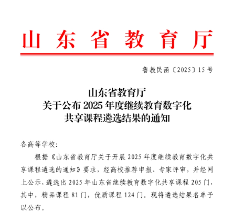 近日,山东省教育厅公布2025年度山东省继续教育数字化共享课程、社区教育优秀课程资源遴选结果。山东医学高等专科学校13门课程成功入选,其中3门获评继续教育数字化共享课程,10门入选社区教育优秀课程资源。